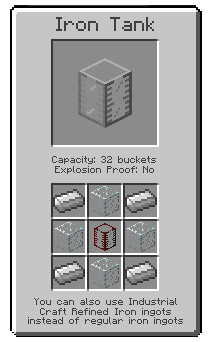 Мод Iron Tanks добавит в игру различные емкости для хранения воды. Данный мод был ориентирован, как добавление к моду BuildCraft, но так же совместим и с другими индустриальными модами. После установки данного мода у вас не возникнет проблем с тем, где хранить воду. Вы в любое время сможете создать емкость для хранения избытка воды.